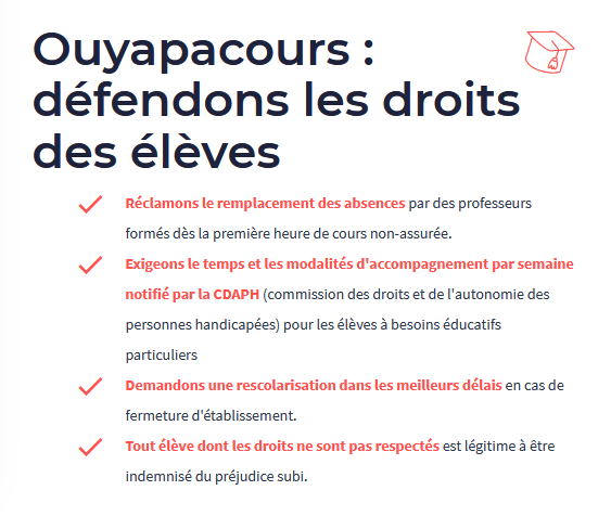 Devant le constat alarmant de plus en plus d’heures de cours perdues, la FCPE nationale a créé un outil pour quantifier ces heures, de manière à avoir des arguments face à l’Éducation Nationale. Cet outil, c’est Ouyapacours et n’importe quel parent peut déclarer des heures de cours perdues, liées à une absence de professeurs ou d’AESH (Accompagnant·e d’Élève en Situation de Handicap)